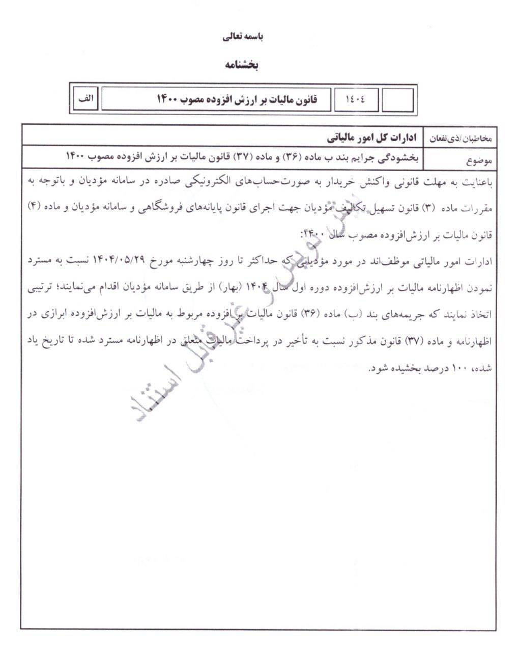 ادارات امور مالیاتی موظف اند در مورد مودیانی که حداکثر تا روز چهارشنبه مورخ ۱۴۰۴/۰۵/۲۹ نسبت به مسترد نمودن اظهارنامه مالیات بر ارزش افزوده دوره اول سال ۱۴۰۴ بهار از طریق سامانه مودیان اقدام می نمایند ترتیبی اتخاذ نمایند که جریمه های بند ب ماده ۳۶ قانون مالیات بر ارزش افزوده مربوط به مالیات بر ارزش افزوده ابرازی در اظهارنامه و ماده ۳۷ قانون مذکور نسبت به تاخیر در پرداخت مالیات متعلق در اظهارنامه مسترد شده تا تاریخ یاد شده، ۱۰۰ درصد بخشیده شود.