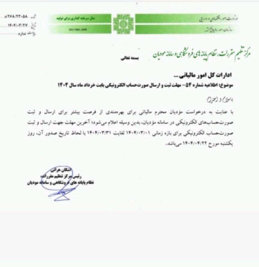 سازمان امور مالیاتی کشور طی اطلاعیه‌ای جدید اعلام کرد: فعالان اقتصادی فرصت بیشتری برای ثبت و ارسال صورت‌حساب‌های الکترونیکی در اختیار خواهند داشت. بر این اساس، مهلت ارسال و ثبت صورت‌حساب‌هایی که تاریخ صدور آن‌ها بین ابتدای خرداد تا پایان خرداد ۱۴۰۴ است، تا روز یکشنبه ۲۲ تیرماه تمدید شده است.