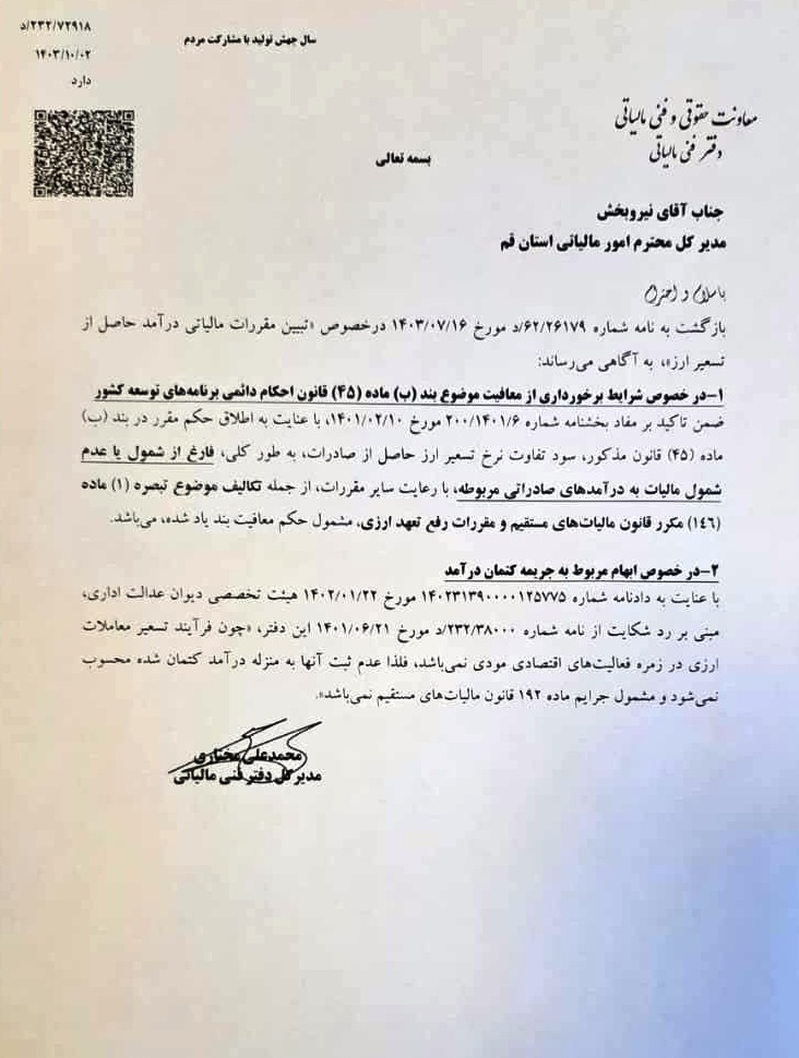 بازگشت به نامه شماره ۲۶۱۷۹/۶۲/ د مورخ ۱۶/۰۷/۱۴۰۳ در خصوص تبیین مقررات مالیاتی درآمد حاصل از تسعیر ارز به آگاهی می رساند: