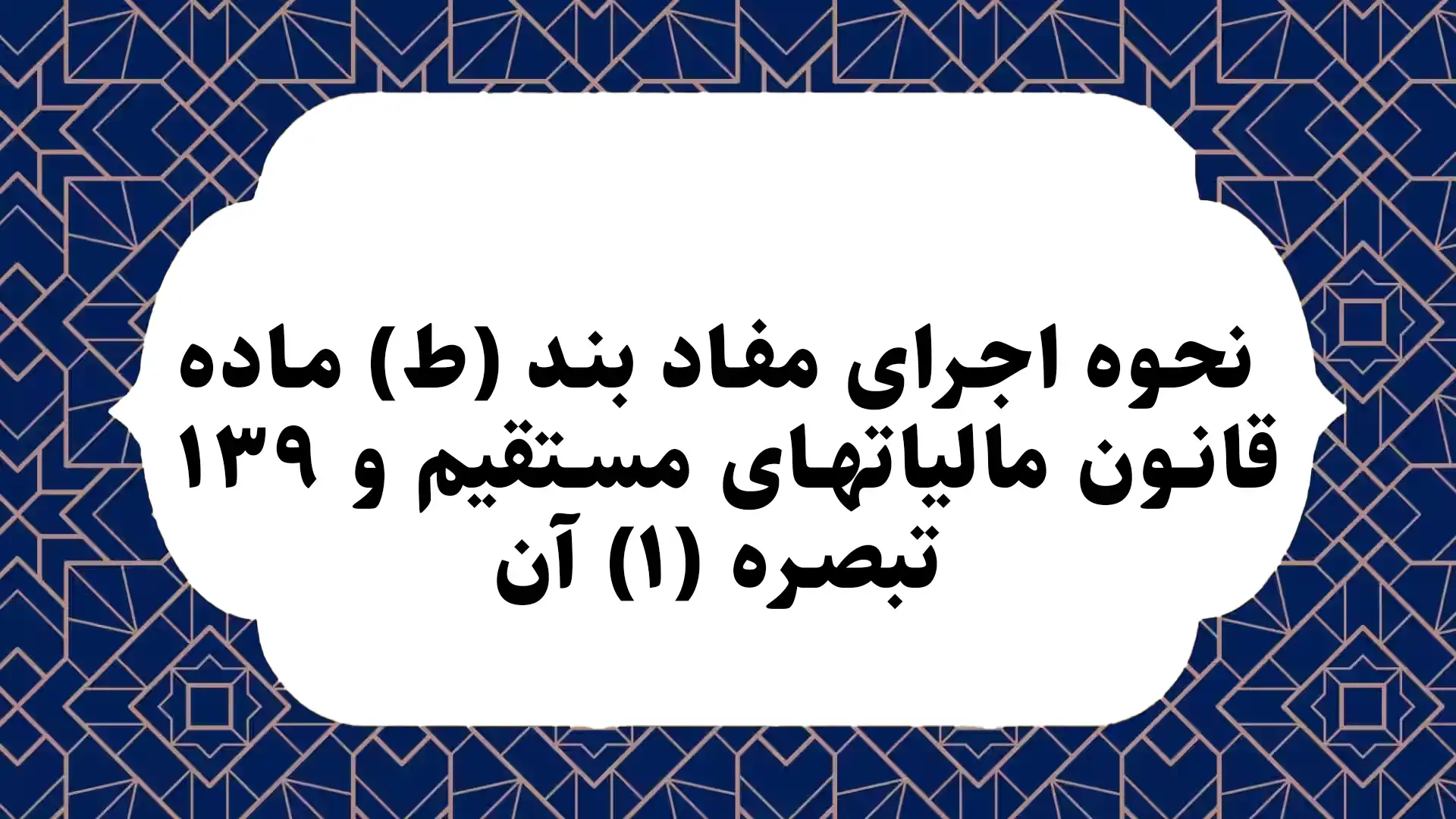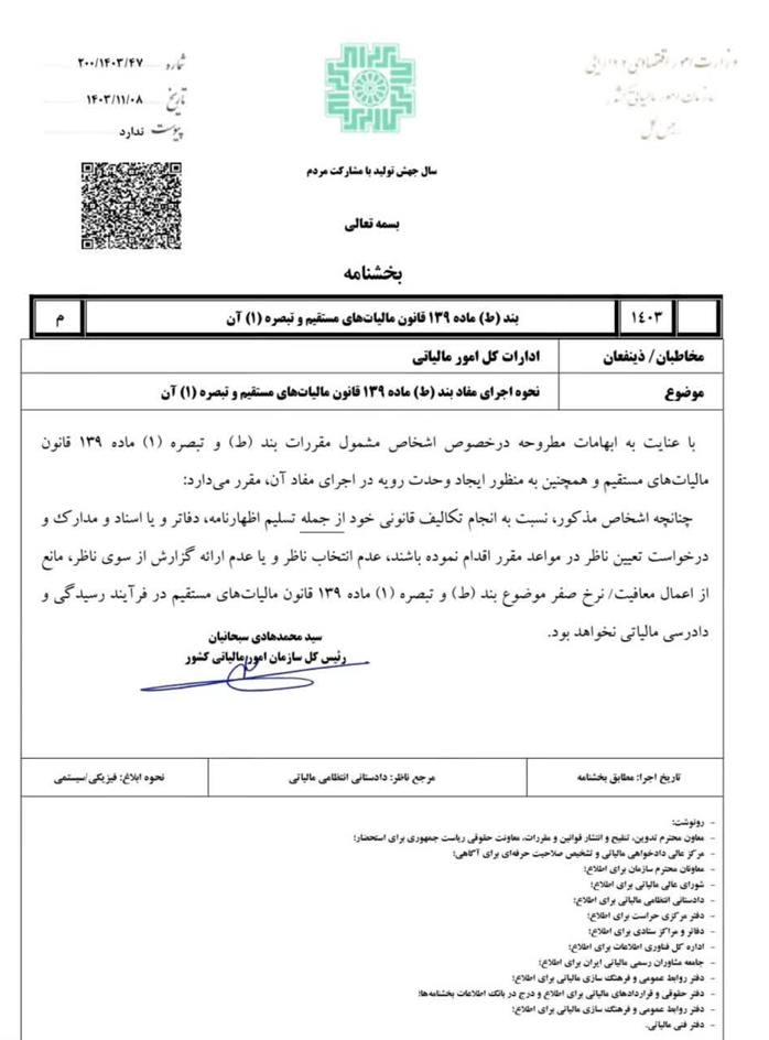 با عنایت به ابهامات مطروحه در خصوص اشخاص مشمول مقررات بند (ط) و تبصره (۱) ماده ۱۳۹ قانون مالیات های مستقیم و همچنین به منظور ایجاد وحدت رویه در اجرای مفاد آن مقرر می دارد: