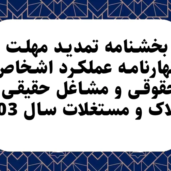 بخشنامه تمدید مهلت اظهارنامه عملکرد اشخاص حقوقی و مشاغل حقیقی و املاک و مستغلات سال ۱۴۰۳Takmanتیر ۲۳, ۱۴۰۴موضوع تمدید مهلت تسلیم اظهارنامه مالیاتی واحدهای حقیق و حقوقی به موجب مصوبه مراجع قانونی واحدهای حقیقی و حقوقی می ... ادامه مطلب