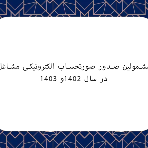 مشمولین صدور صورتحساب الکترونیکی مشاغل در سال ۱۴۰۲و ۱۴۰۳Takmanفروردین ۲۵, ۱۴۰۴مشمولین صدور صورتحساب الکترونیکی مشاغل در سال ۱۴۰۲و ۱۴۰۳ کلمات کلیدی:صورت حساب الکترونیکی مالیاتیءمعافیت مالیاتیءسامانه مودیانءاشخاص حقیقی و حقوقی اشخاص ... ادامه مطلب